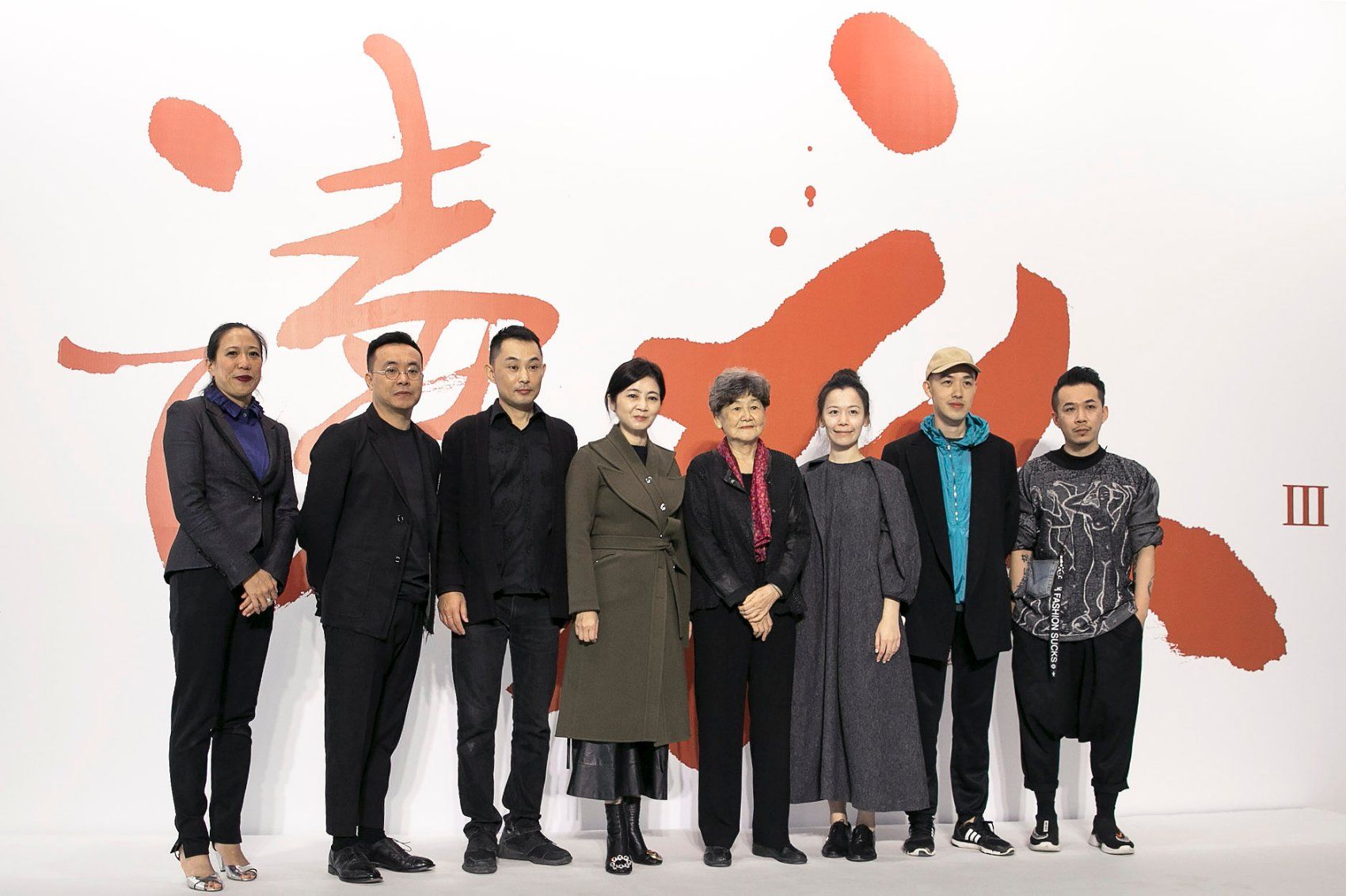長達22米的入口背牆對內創造了窄長的通行廊道,這是進入讀衣III藝術時尚跨界展位於西一館主展場的哲學之道。多片尺幅高達2米9的白色半透明帷幕在展場上編織出「黑白」丶「光影」丶「明暗」丶「穿透」丶「遊移」丶「離合」的空間氛圍,在之字形的觀展動線上,六個服裝設計展區自隱至顯,呈現無字背後「老莊」思想與「禪宗」「空性」哲學下「有無之間」的詩般意境,與當代藝術家董陽孜集結了多款字體的「無」字與解構文字線條的墨寶區遙相呼應。