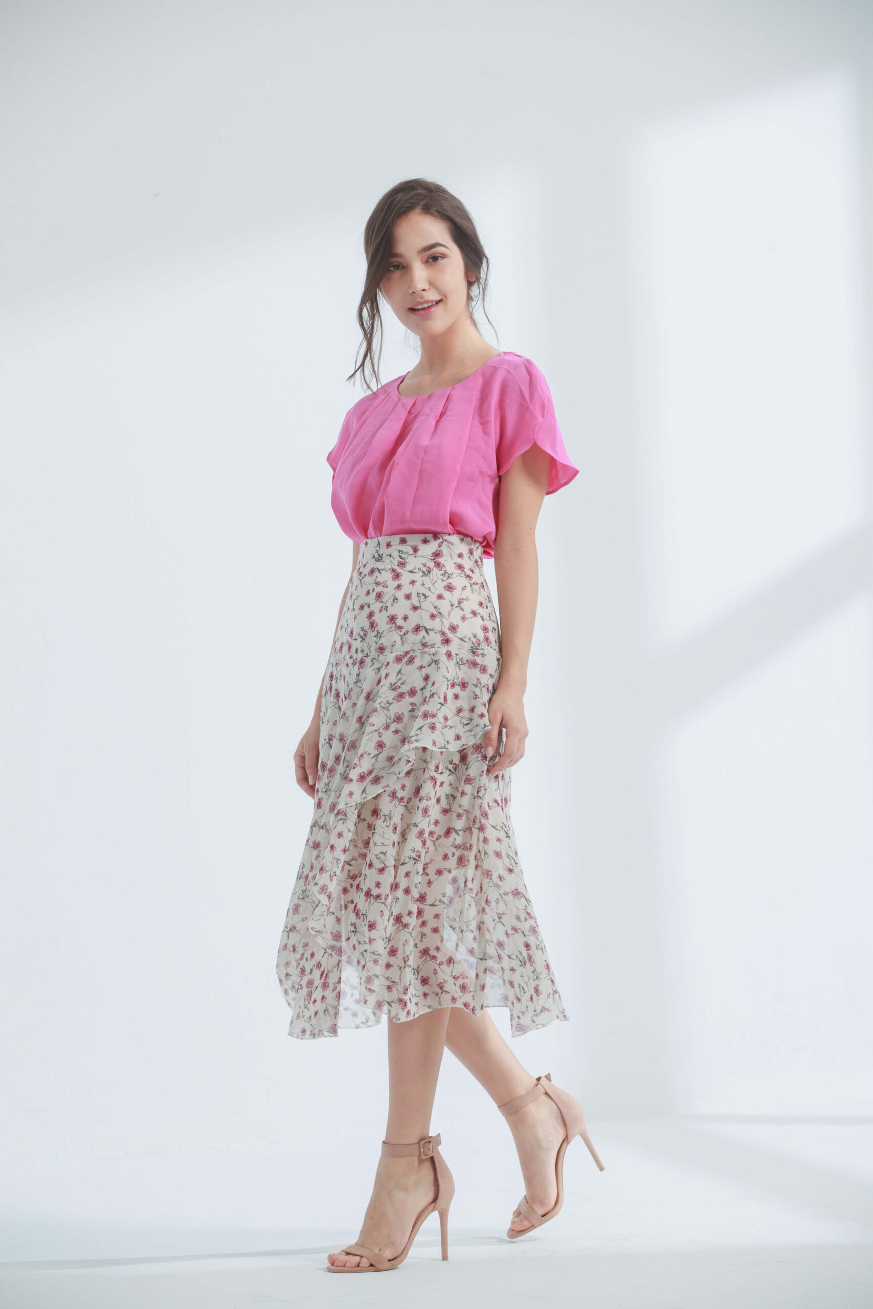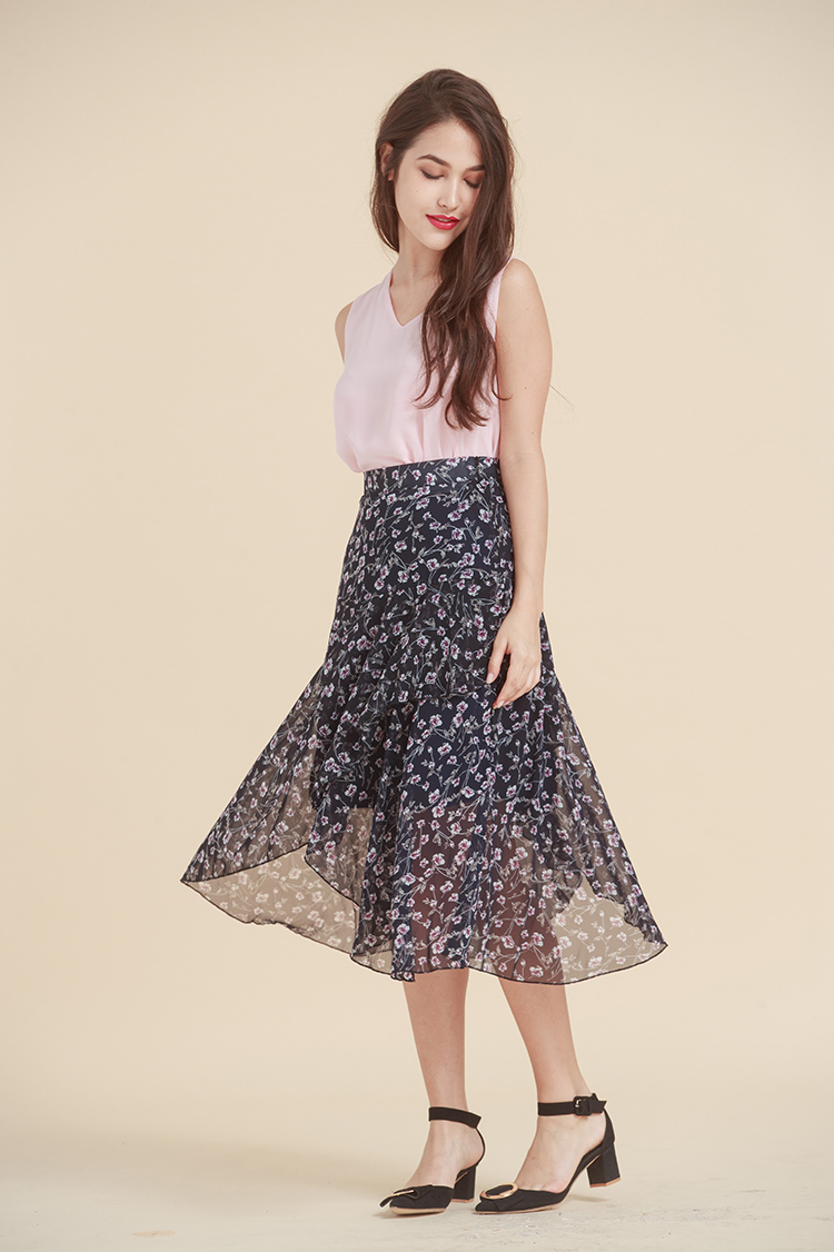 珍珠白襯衣&緊連薄紗荷葉碎花裙