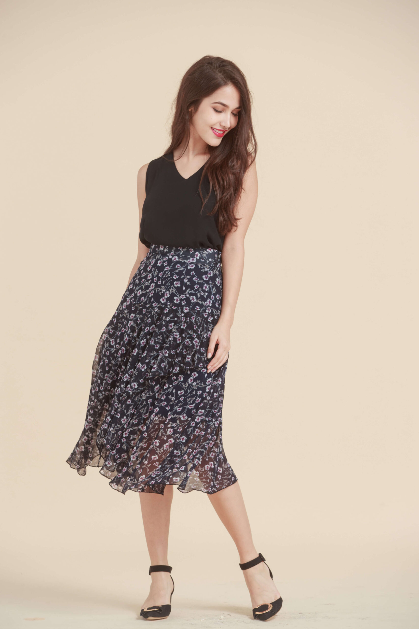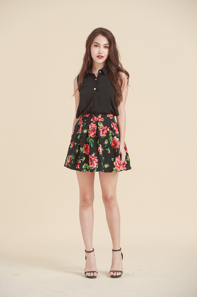 無袖黑襯衣&紅花短裙